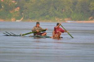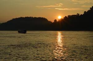 Efter att ha vandrat huvudgatan ner i den tryckande värmen och besökt en Wat bestämde vi oss för att falla i turistfällan och köpa en ”solnedgångskryssning” på Mekhonfloden. Vi fick en alldeles egen båt som stävade upp för floden i ungefär en halvtimme innan den vände upp så att vi hade fritt synfält väster ut mot den nedgående solen. Det var väldigt fint och lugnt och trevligt och när solen hade gått ned bakom horisonten, då startade föraren båten igen och åkte till ett annat ställe med lägre berg, så vi fick se solen gå ner igen. Två solnedgångar på en och samma kväll alltså. Bra jobbat.