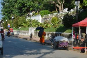 Det var ingen lång taxiresa och det gick inte särskilt fort heller. Luang Prabang är ingen stor stad och den ligger lite avsides. Miljön påminde mig om när jag var uppe i nordnorge snarare än om sydostasien i övrigt. Det fanns ingen trafik heller, vilket kändes jättekonstigt.