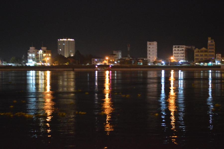 Egentligen är klockan bara 18.30, men visst ser det stämningsfullt ut? Detta är dock inte Mekong, utan Tonle Sap-floden.