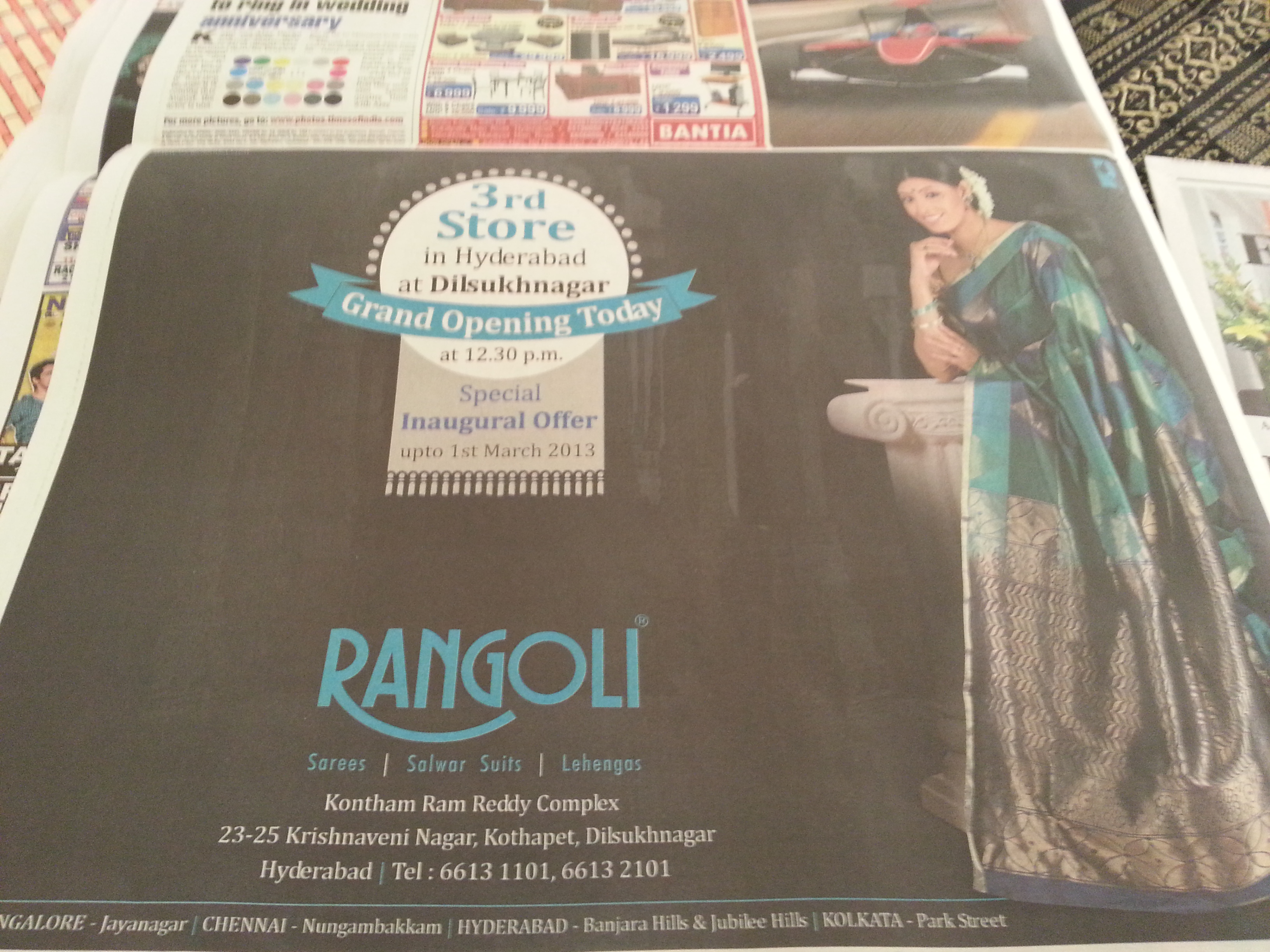 Jag avslutar med en liten bild. Den här reklamen dök upp i dagens tidning och jag kan inte riktigt bestämma mig om jag tycker att det är osmakligt, vältajmat eller helt orelaterat. Det handlar alltså om en klädkedja som idag slår upp en ny butik Dilsukhnagar – alltså precis där bomberna briserade i torsdags. Man har i alla fall inte lagt till sloganen ”när du ändå är här och tittar efter blodspår kan du passa på att köpa lite kläder”…