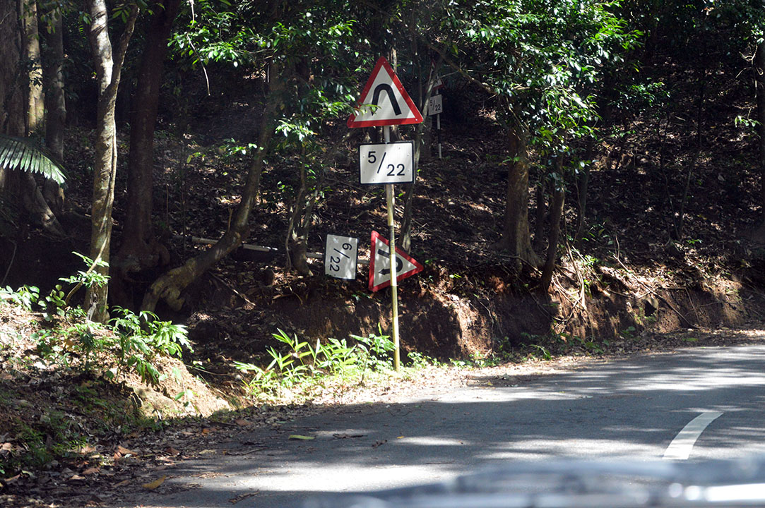 Klättringen upp för berget var väldigt spännande med hårnålskurvor och brådstup precis vid den bitvis toksmala vägen. För att underlätta för skärrade turister hade man satt upp skyltar som talade om hur många hårnålskurvor det var kvar. Här närmar vi oss kurva 5 av totalt 22. Notera också att sexans skylt trillat ner. Nummer 6 var precis runt hörnet. En sak att komma ihåg är också att detta bara visar hårnålskurvorna. Det fanns rätt många kurvor på strax under 180 grader också.