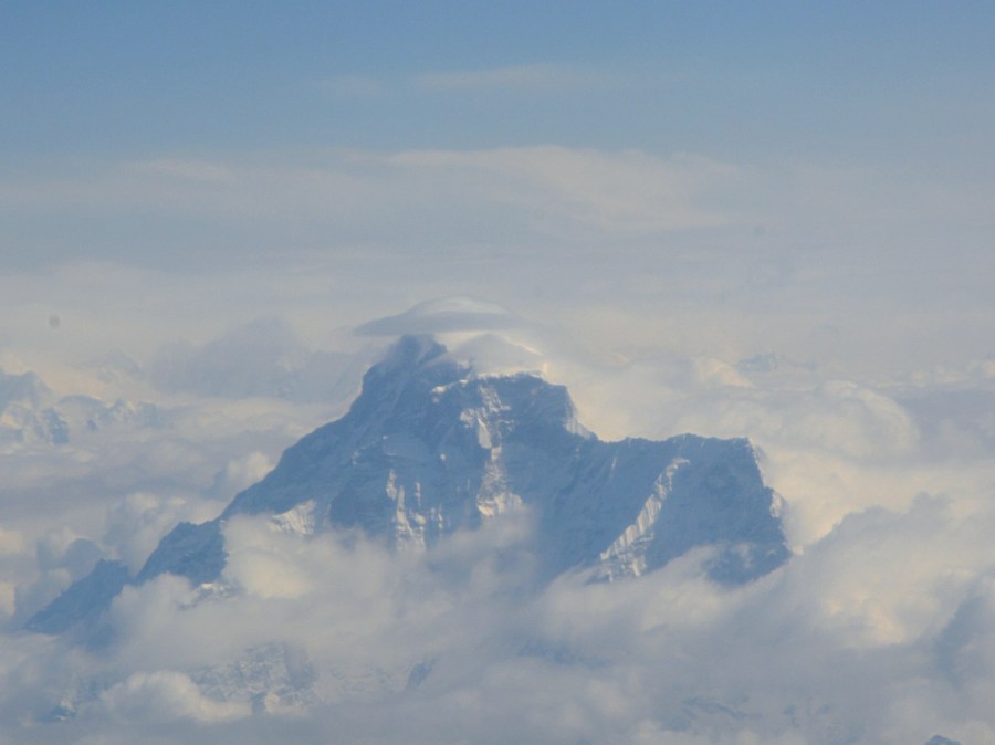 Det var mycket moln, rutan i planet var rätt smutsig och dessutom fick jag ta bilder genom propellern. Så de flesta av mina knappt 200 bilder av Himalaya blev såhär eller sämre.