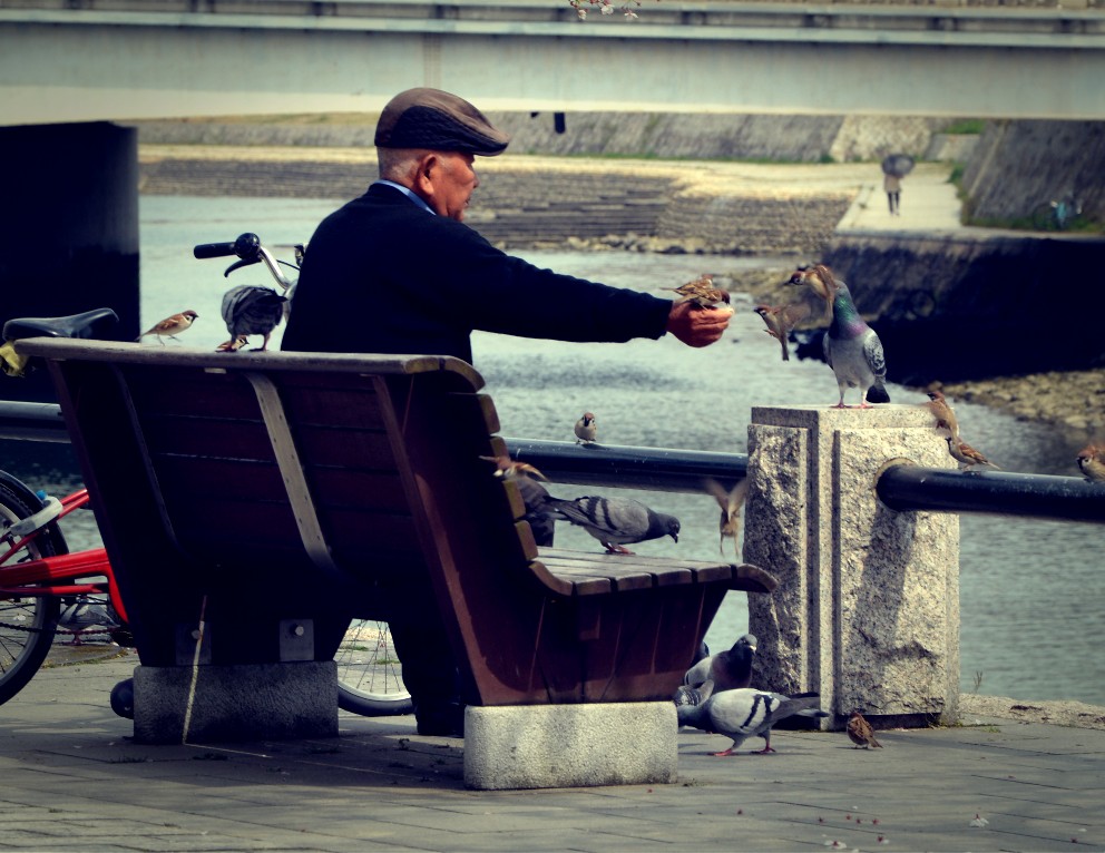 Mitt emot Atomic Dome satt den här gubben och matade fåglar. Alldeles efter det att jag tagit bilden kom en liten kille och skrämde bort alla fåglar. Då fick han sig en tillsägelse av fågelmannen.