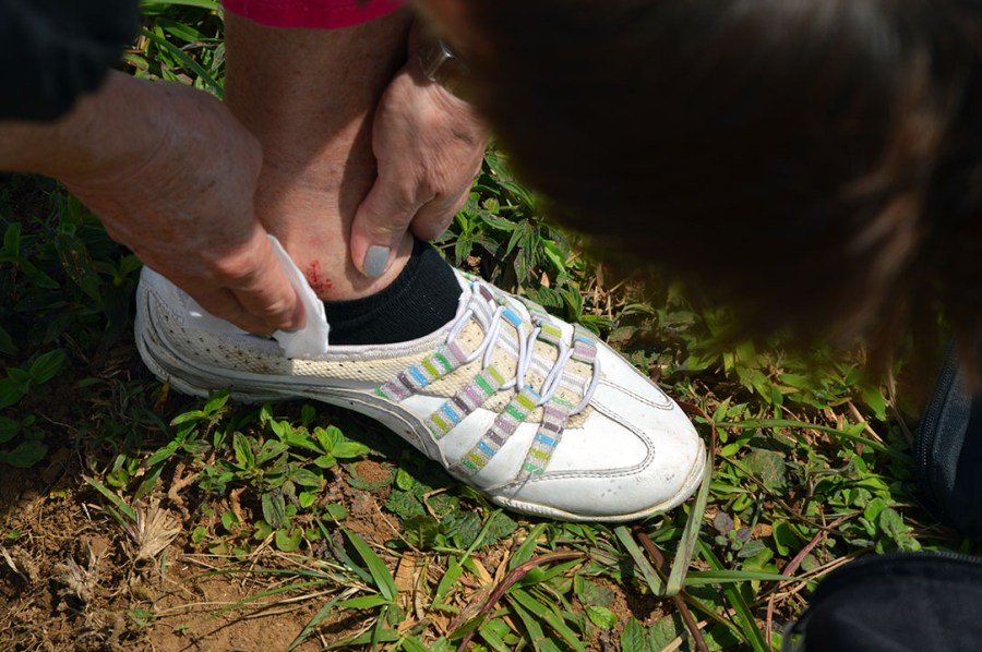 Jag var lite orolig att mamman med kryckan skulle snubbla och skada sig. Istället är det den andra mamman som kliver på en lös sten och slår upp ett litet sår på ankeln. Som tur var har vi antiseptiska dukar med oss att göra rent med.