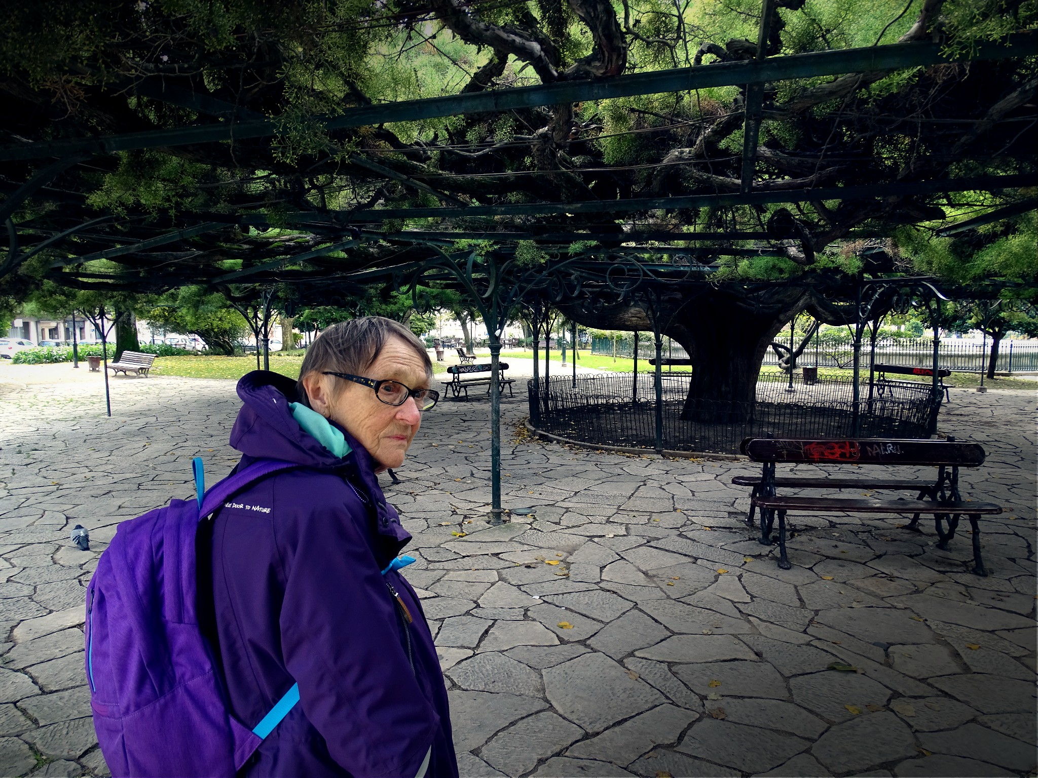 Det här trädet är tydligen jättegammalt och har en krona som bärs upp av en stålställning. Väldigt imponerande, men mamman börjar nog känna av allt turistande vid det här laget. Dags att ta sig till hotellet för en lutare innan middag.