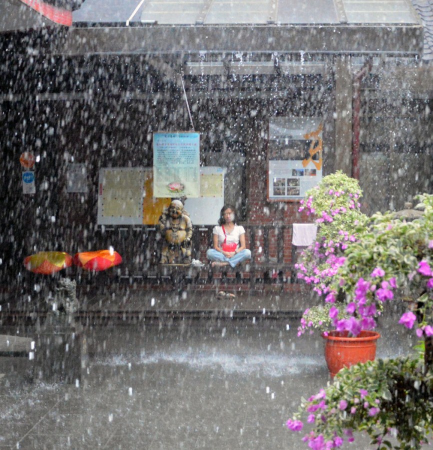 Under besöket i det kombinerade Buddhist- och Taoist-templet, så kom det en hyfsat rejäl skur, så då fick vi vänta en stund innan vi kunde gå vidare. För mig var det en ofrivillig stund av stillhet, men andra tog tillvara på möjligheten.