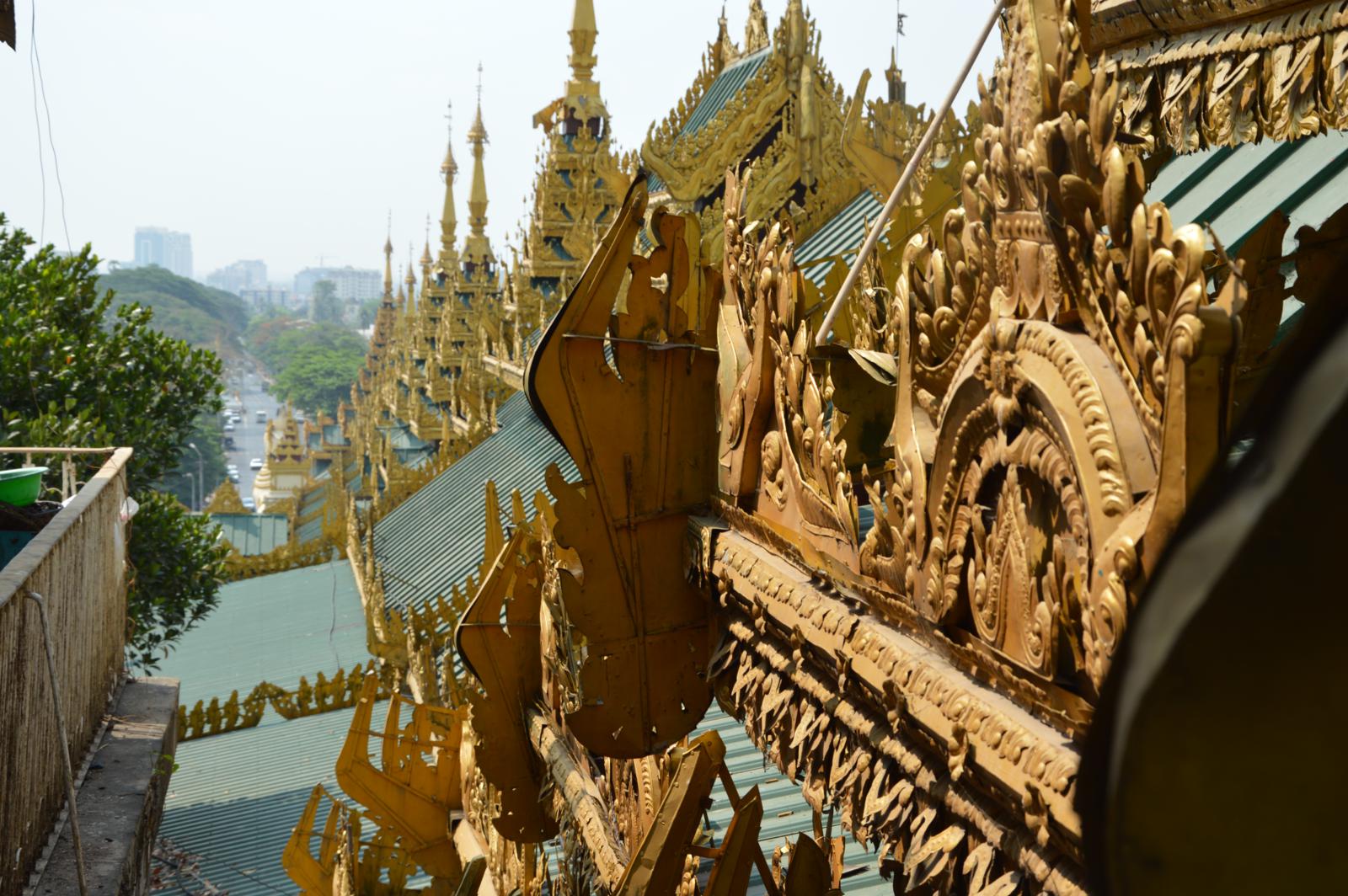 Shwedagonpagoden är stor och förgylld och syns från stora delar av staden (inklusive mitt hotellrum om man lutar sig lite ut). Så här ser staden ut när man står mitt bland allt det där guldet.