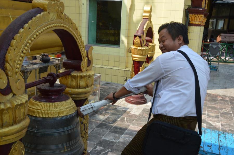 Vår guide visar hur man slår i klockan i pagoden för att tala om för alla att man kommit fram. Denna sed härstammar från tiden innan mobiltelefonens intåg, vilket för det här landet var för bara några år sedan.