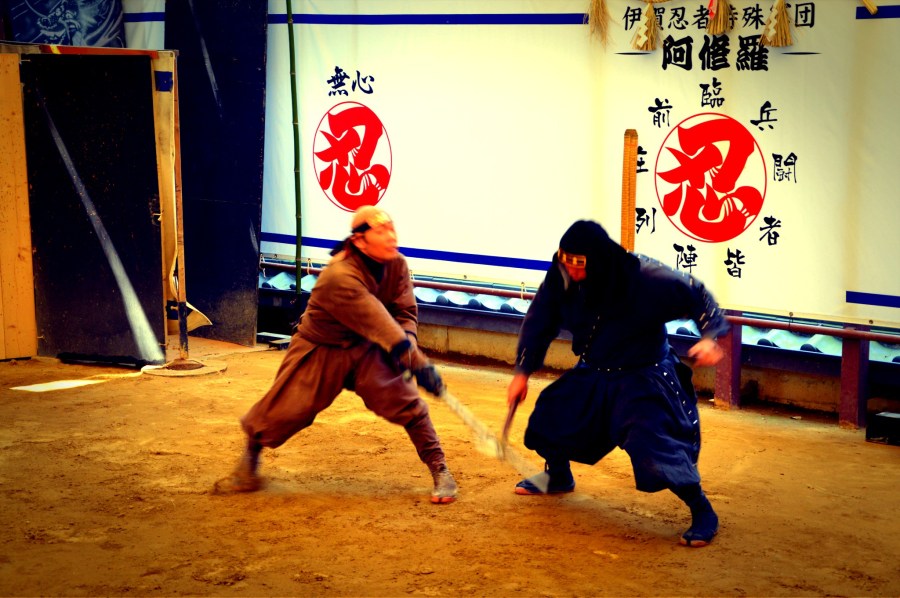 Ninjamästaren visar hur man spöar upp en snubbe med svärd.