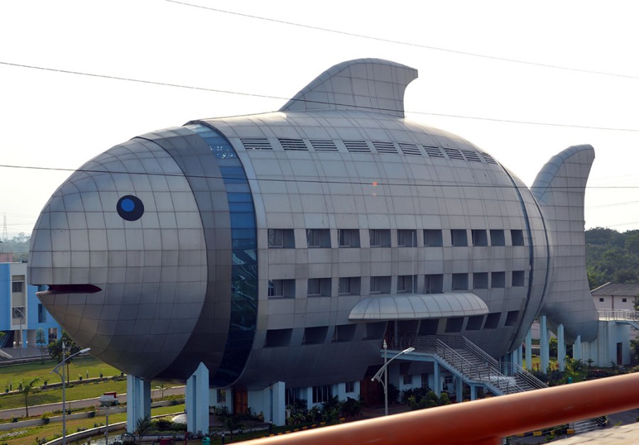 Jodå, det här är faktiskt ett hus. Som ser ut som en fisk. Enligt uppgift inhyser detta hus fiskeriverket för delstaten Andhra Pradesh. Indier har också humor. Undrar när vi får se en liknande byggnad i Göteborg.