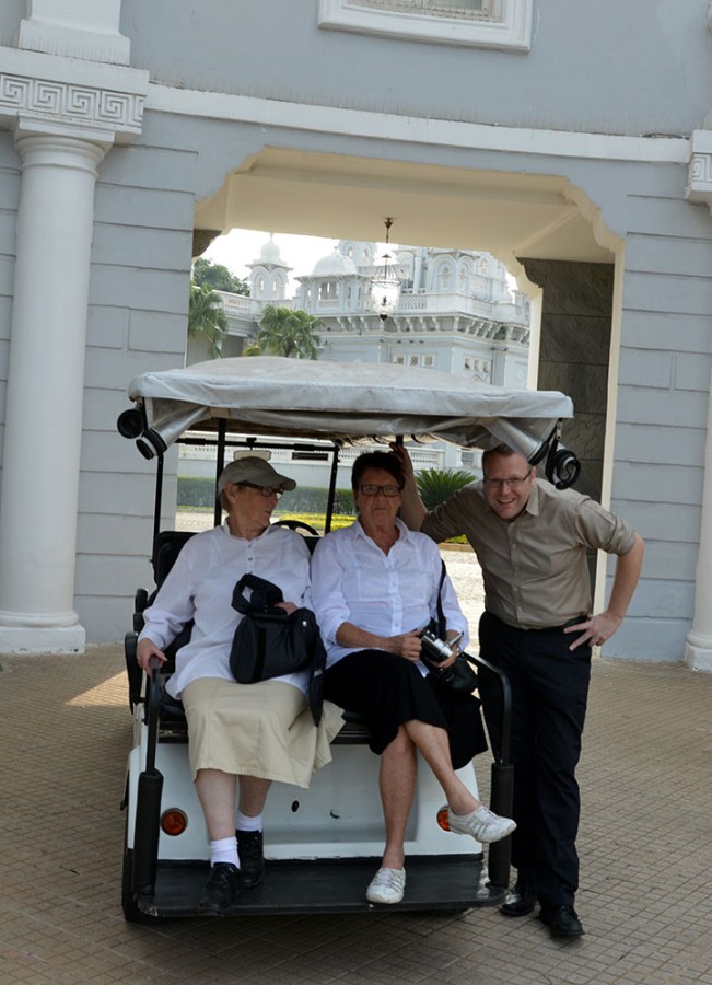 Om man inte bor på hotellet eller betalar extra så får man åka från porten till palatset i en förlängd golfbil. Det är också ganska coolt, faktiskt.