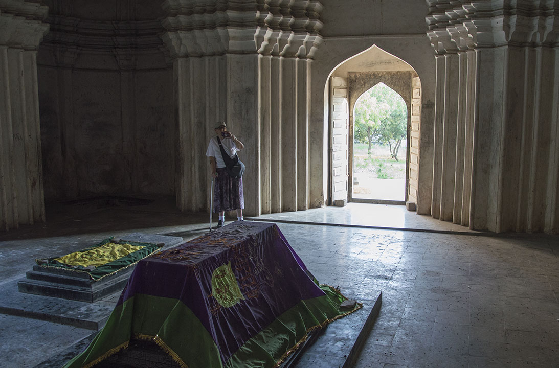 Här är vi inne i en av de öppna kamrarna i Qutb Shah. Precis som i Taj Mahal, så är detta inte den riktiga graven (den ligger i källaren) utan en kopia som man byggt upp för att visa hur det ser ut därnere. Jag har för mig att detta var graven till Qutb Shah nummer 5.