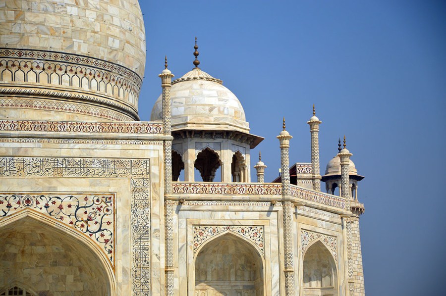 Hela Taj Mahal är fylld av såna här blommor och figurer. Det är olika former av nästan-ädelstenar som man har lagt in i den vita marmorn genom att först knacka ut hål i marmorn, skära till de olika färgade stenarna till rätt form och sedan klistra in dem med någon form av hemligt lim. Att limmet funkar bra kunde man bland annat se i taket på stora kammaren där det satt ett inlagt mönster som suttit där i 350 år.