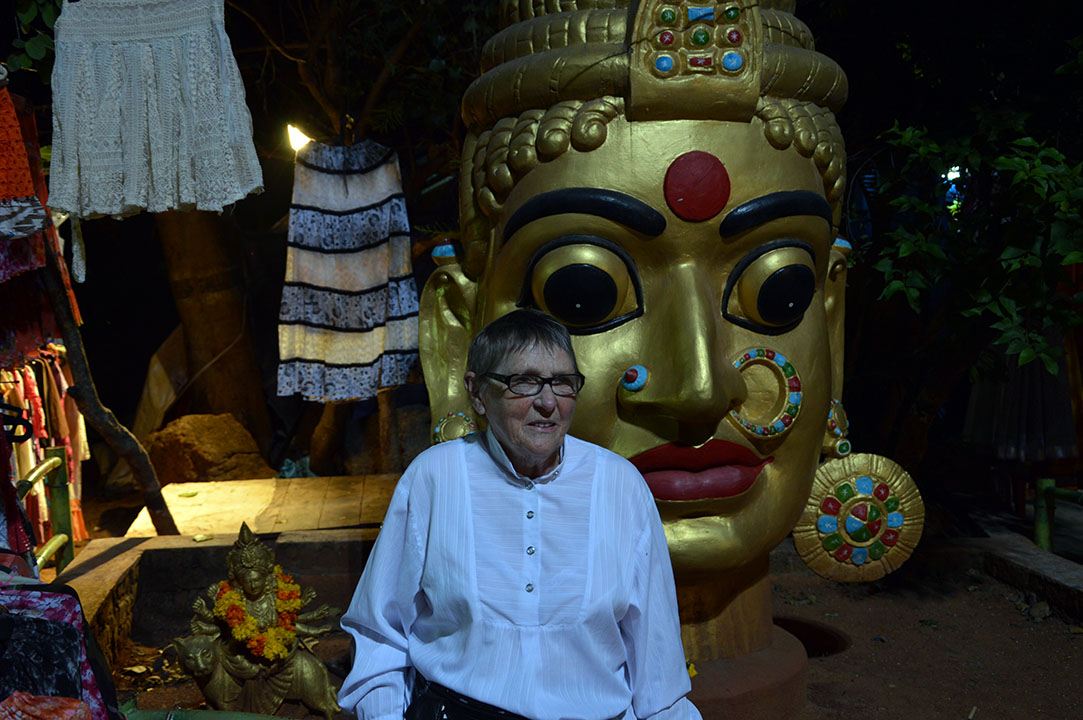 En trött mamma poserar lite lätt framför en typisk hinduisk staty i den typsikt hinduiska byn i den typiskt indiska marknaden tillrättalagd för turister som vill uppleva Indien utan trängseln, ljudnivån, smutsen och tiggarna.