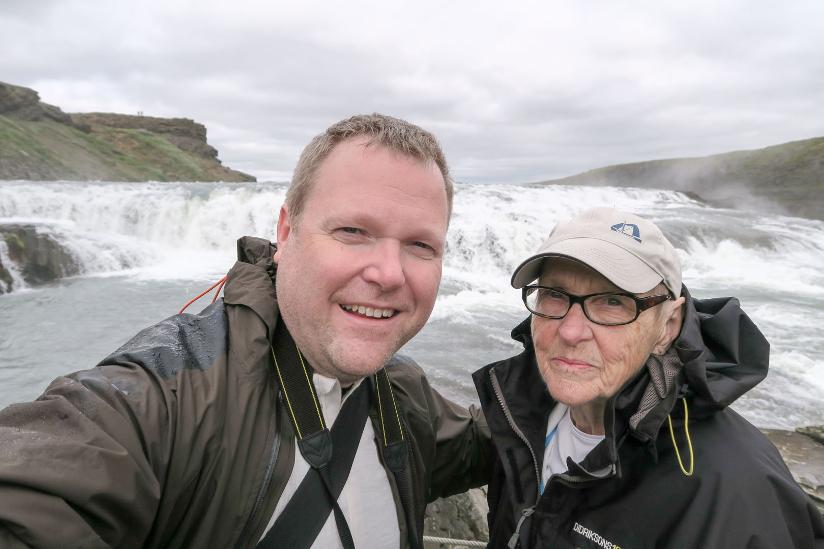Här är mor och son Nilsson så nära Gullfoss man kan komma utan att bli blöt om fötterna. Blöt överallt annat blev vi däremot.