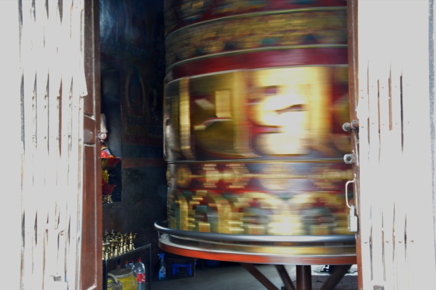 I den sista stupan för dagen hade man rationaliserat bort att folk skulle snurra på bönerullarna. Här fanns det en jättestor rulle som snurrade av sig själv. Otroligt praktiskt. Notera också det konstnärliga fotografiet med rörelseoskärpa så ni ser att rullen snurrar.