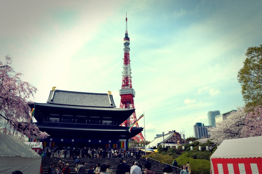I förgrunden ser vi ett tempel, som säkert är jättegammalt. I bakgrunden ser vi Tokyo Tower som också är ganska gammalt, men liksom känns mer modernt. Framför templet pågick någon form av ceremoni, som inkluderade de där stora trummorna de gillar i Japan, och runt omkring mig satt moderna människor och åt lunch. Al fresco.