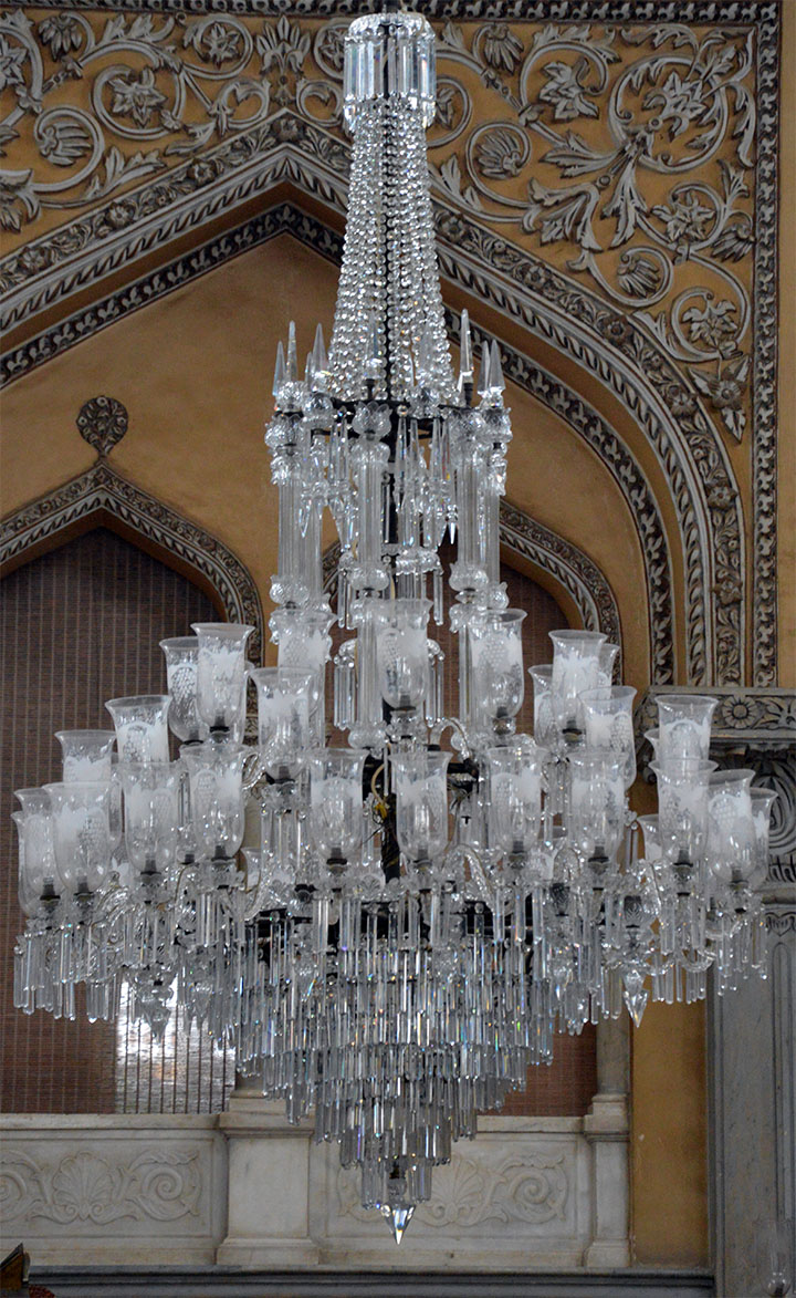 Tronsalen i Chowmahalla Palace innehåller ett antal sådana här kristallkronor. Jag fick det till 21, Ann-Charlotte fick det till 16, förmodligen ligger det riktiga antalet någonstans där emellan. Undrar vem det är som putsar alla dessa kristaller så att de ser så fina ut…