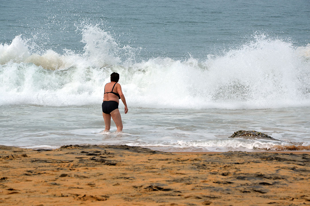 Min damer ville inte att jag skulle publicera någon badbild av dem, men det var svårt att få en känsla för hur stora vågorna var utan någon form av referens. Vågorna var väldigt stora och båda damerna drattade omkull där de stod precis i strandkanten. Inte så konstigt. Jag höll också på att slås omkull och då är jag större, tyngre, starkare och yngre…