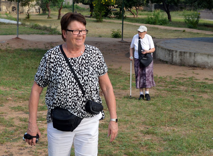 Ann-Charlotte kan inte sluta le och studsar omkring bland Qutb Shahs gravar som en kalv på grönbete.