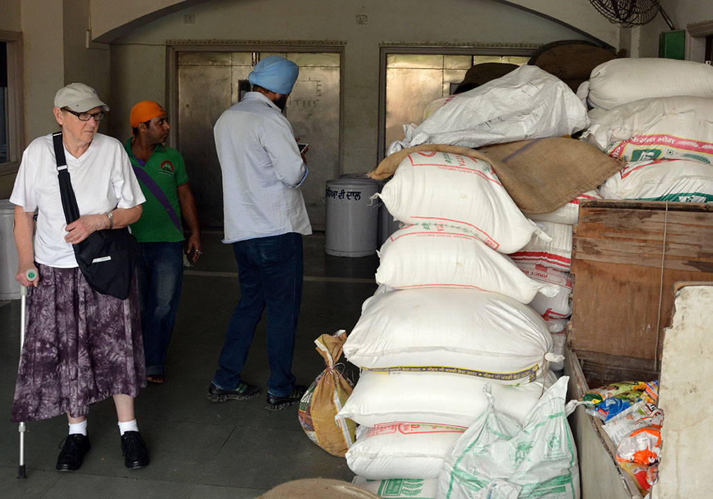 Mamma inspekterar lagret med vetemjöl och salt på vägen in i Sikhtemplet. Vem som helst kan skänka mat till templet, mat som sedan delas ut till alla som vill ha. Tre gånger om dagen.