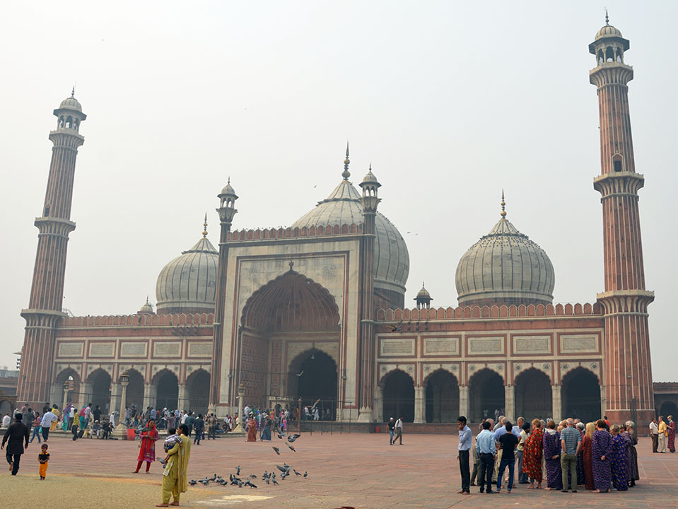 Så här ser den ut, Indiens största moské. Byggd 1647 till 1656 av en massa tusen arbetare dygnet runt. Men så har den också hållit sig ganska bra de senaste 450 åren. Innan engelsmännen tog över Indien, så var det alltså mogulerna från Mongoliet som härskade. De var muslimer och alltså finns det en massa moskéer i krokarna.