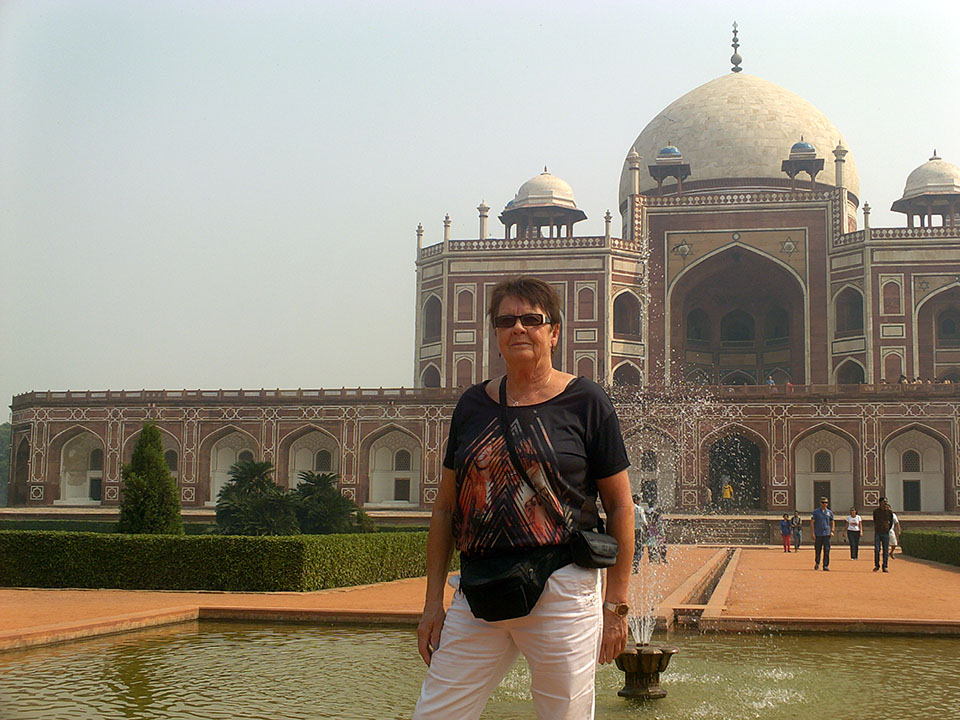 Ann-Charlotte poserar framför gravmonumentet. Känns lite som hon tänker ”mitt”.