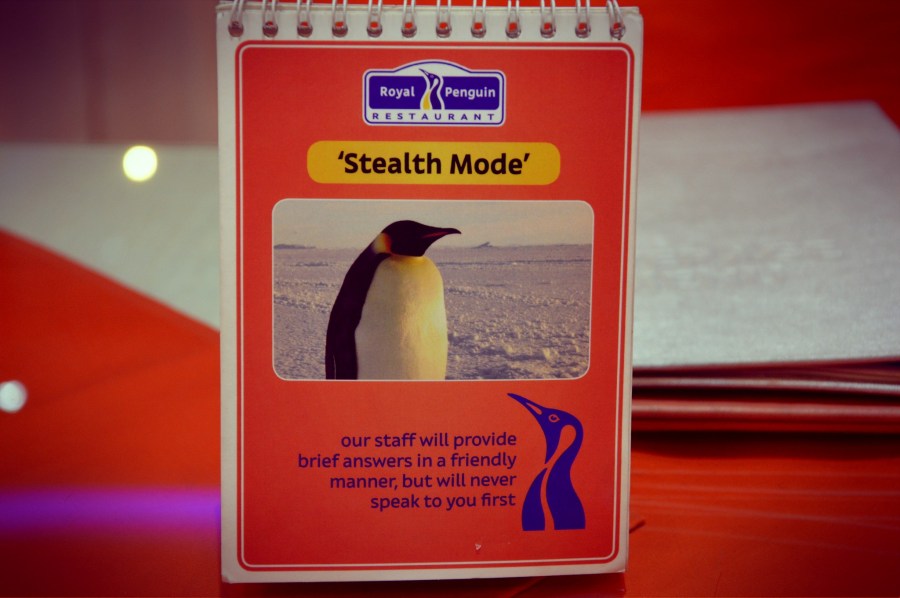 På restaurangen på hotellet kan man bestämma hur trevlig personalen skall vara. Såna här kort borde finnas överallt!