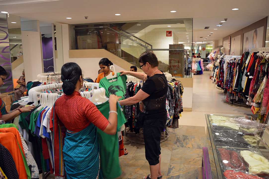 Ann-Charlotte tittar på t-shirtar, men ger upp när 4XL är för liten. Mamma tittade på en skjorta, men fick inte på sig en 2XL och de hade inget större i den färgen. Välkomna till Indien, säger jag 🙂