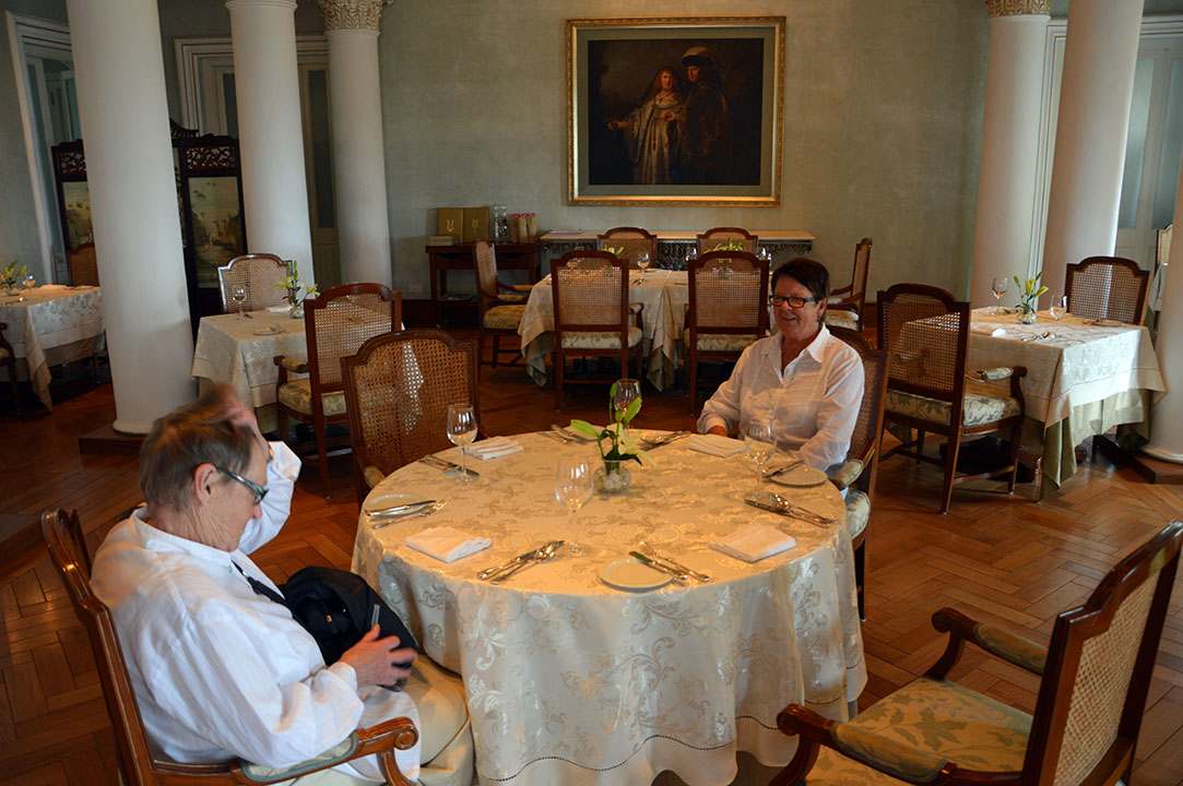 Efter att ha tagit bilder på framsidan, tittat på den fantastiska inredningen och slutligen promenerat genom trädgården bänkar vi oss för lunch på Celeste. När vi kom var det tomt och tyst, men det gick över redan innan förrätten kommit in.
