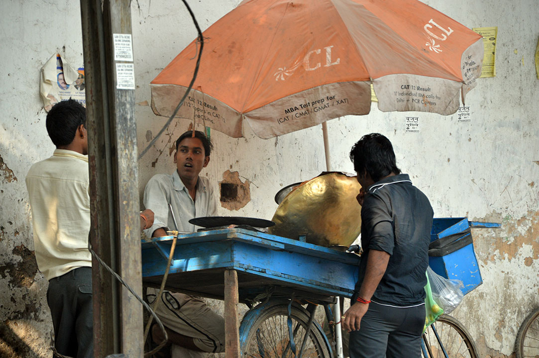 På väg genom Delhi såg vi flera spännande saker. Här är t.ex. en kille som säljer någon form av mat vid sidan av gatan. Undrar om man skulle överleva en måltid här?