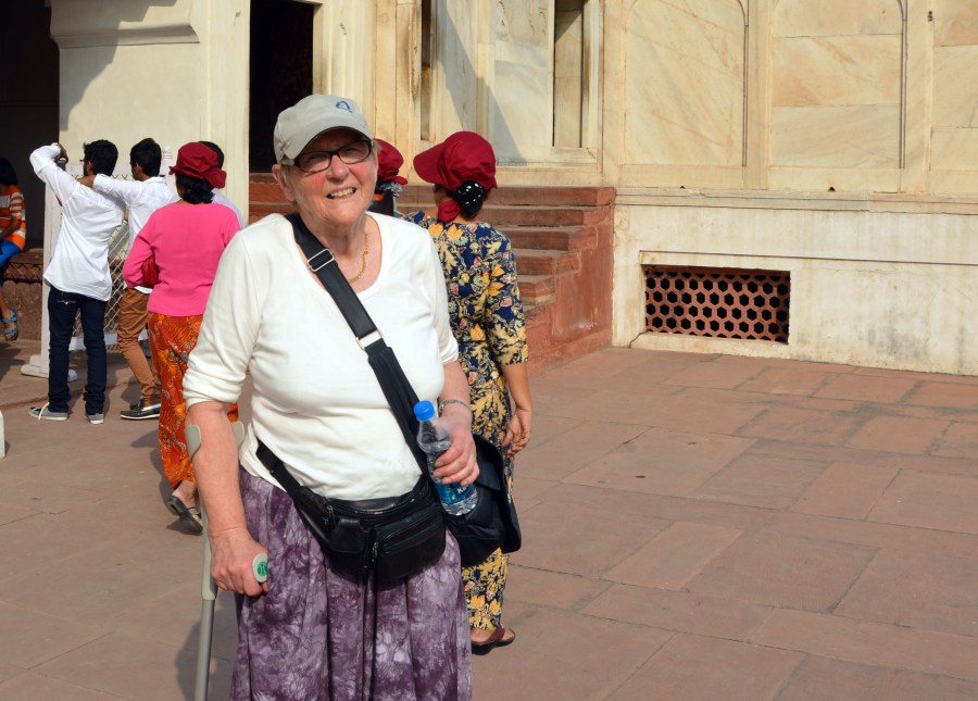 Mamma visar resultatet av en dag i den indiska solen: solbränd, varm och trött.