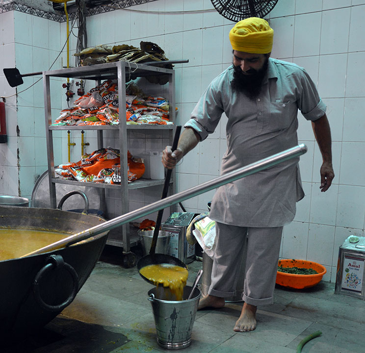 Soppmästaren häller upp en mustig currysoppa till dagens lunch. Spana in grytan till vänster. Inte liten.