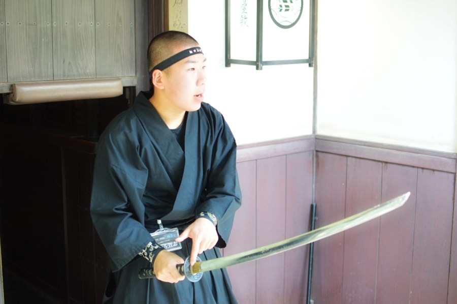 Lillninjan visar upp ett svärd och förklarar vad parerstång är. På japanska, givetvis, men jag kan ju redan det där.