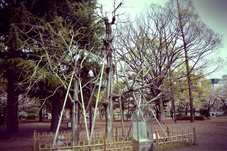Det här trädet överlevde atombomben och flyttades hit till parken så att folk kan se det. Sprickan i trädet vette mot explosionen, men andra sidan är hel och grönskar fortfarande. Fast inte nu, för nu är det fortfarande tidig vår.