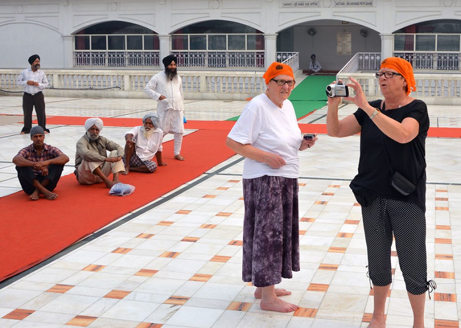 Tre äldre sikher betraktar två äldre svenskor som försöker ta kort.