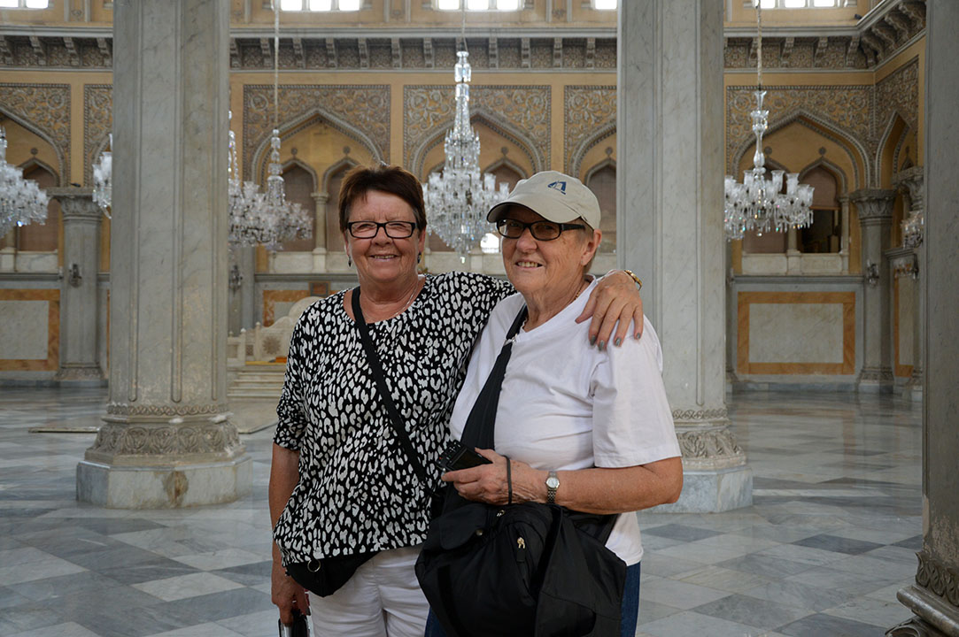 Två drottningar i Nizzamens gamla tronsal. I bakgrunden skymtar man tronen där Nizzam tog emot sina gäster och vi kan också se några av alla kristallkronorna som hänger i taket.
