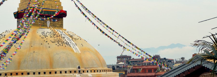 Den här utsikten hade jag från balkongen på den tibetanska restaurangen. Här ser vi stupan, som dubblar som fågelholk, och i bakgrunden ser vi Himalaya. Det är rätt coolt.