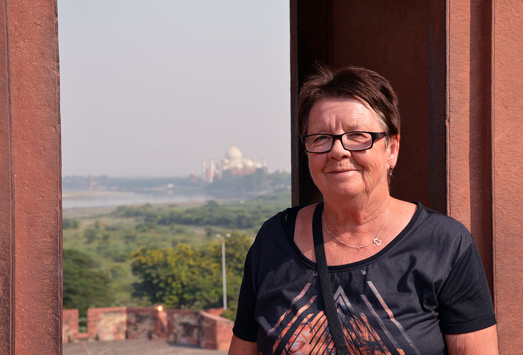 Här står Ann-Charlotte på Agra Fort med Taj Mahal i bakgrunden.
