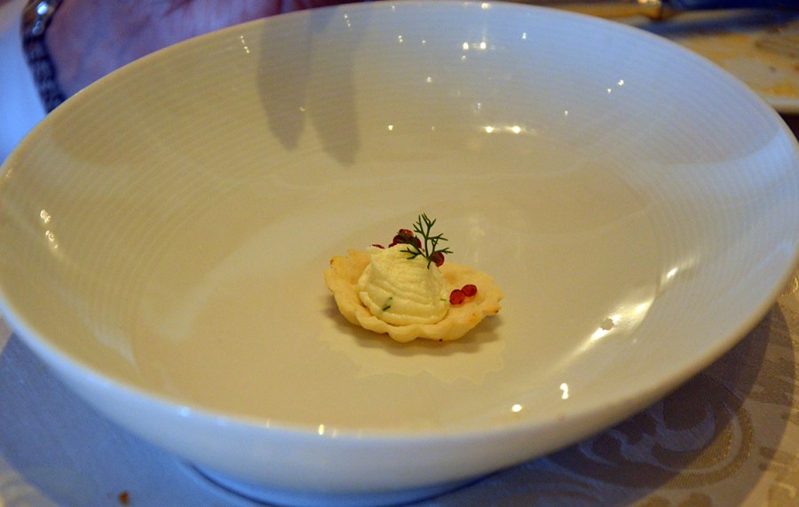 Innan man får förrätten på Celeste får man alltid en liten aptitretare som kocken hittat på för dagen. Den här gången var det någon liten pryl med ostmousse och något bär. När tallrikarna kom in undrade damerna om det här var allt vi fick och sedan följde en utläggning om hur förskräckligt lite mat man får på fina restauranger. Sedan kom maten.
