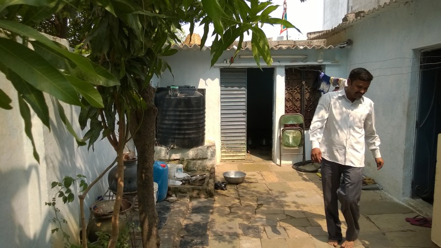 ”Huset” där Azmath bor med sin fru, tre barn, sina föräldrar och sin syster består egentligen av tre hus med ett rum i varje. Jag står i dörren till pappas hus, som dubblar som gästrum och (tydligen) matsal. Till höger är huset där Azmath bor med fru och barn och rakt fram är köket där mamma och syster bor.