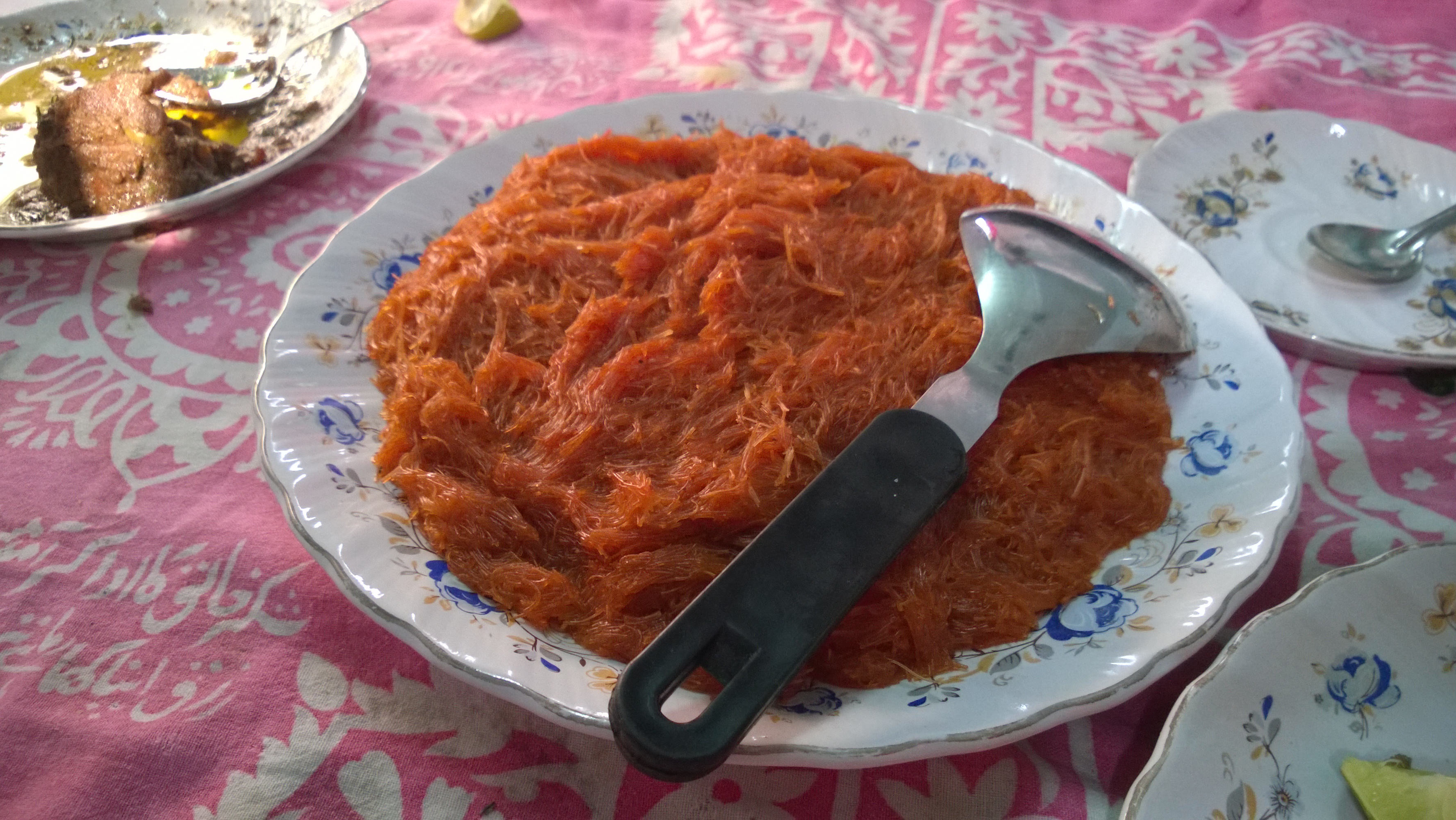 Det ser ut som rårivna morröter, men det är faktiskt en väldigt söt efterrätt. Det är lite som väldigt tunn spagetti som man kokat i sirap och karamellfärg. Smakar lite som vetebulle, vilket kändes rätt knepigt, men gott.