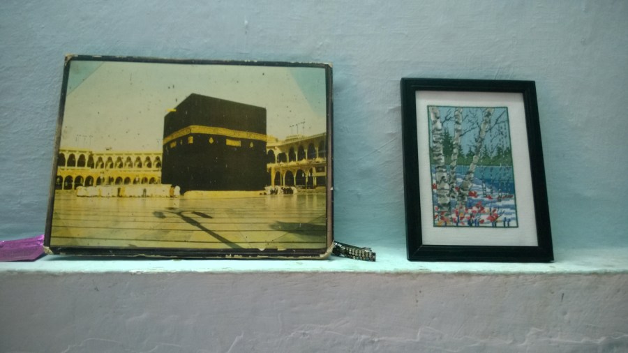 Till vänster ser vi ett gammalt och något blekt fotografi av Mekka, ett måste i varje muslimskt hem. Till höger ser vi en handbroderad bild av ett svenskt vinterlandskap som Azmath fick i julklapp av min mor. Misstänker att det är det närmaste familjen någonsin kommit snö…